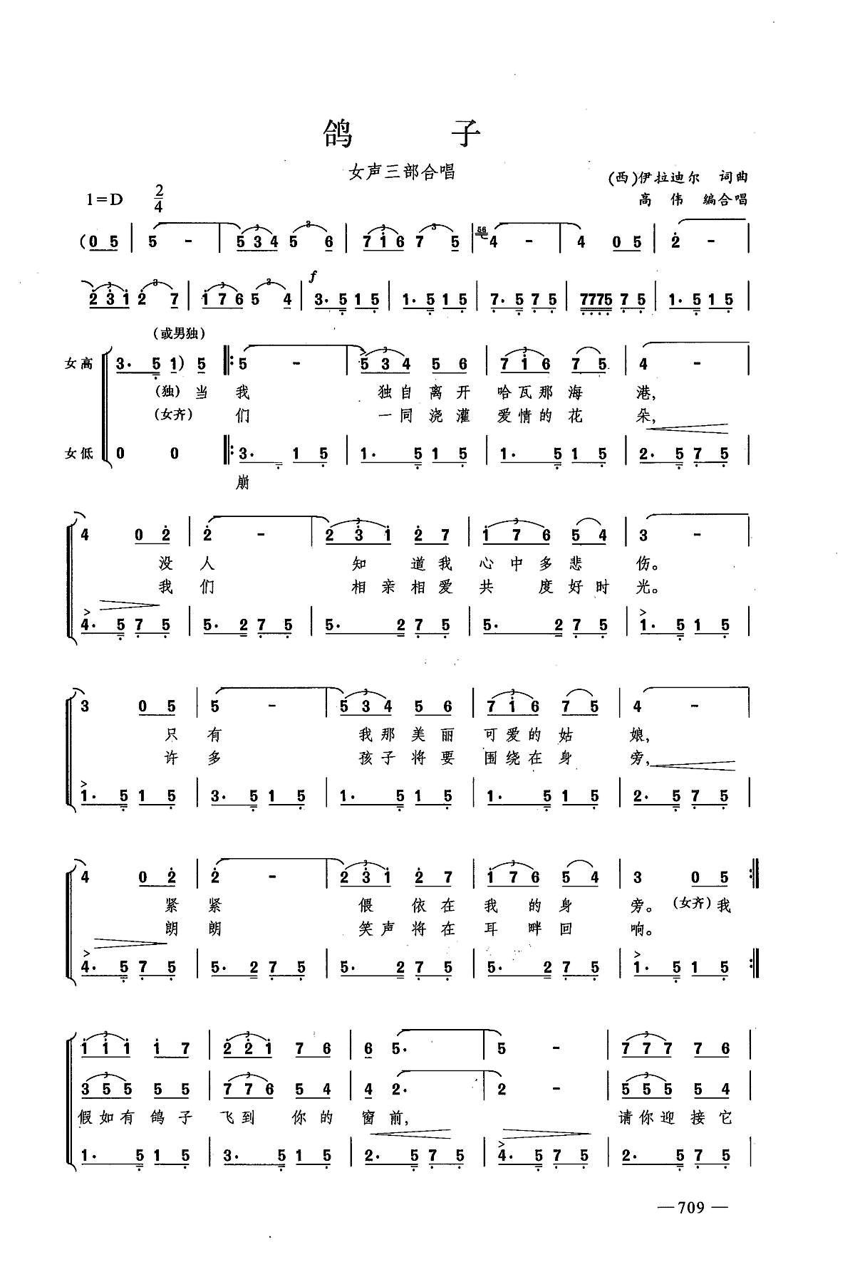 鸽子外国合唱歌曲简谱合唱谱高考谱子声乐合唱