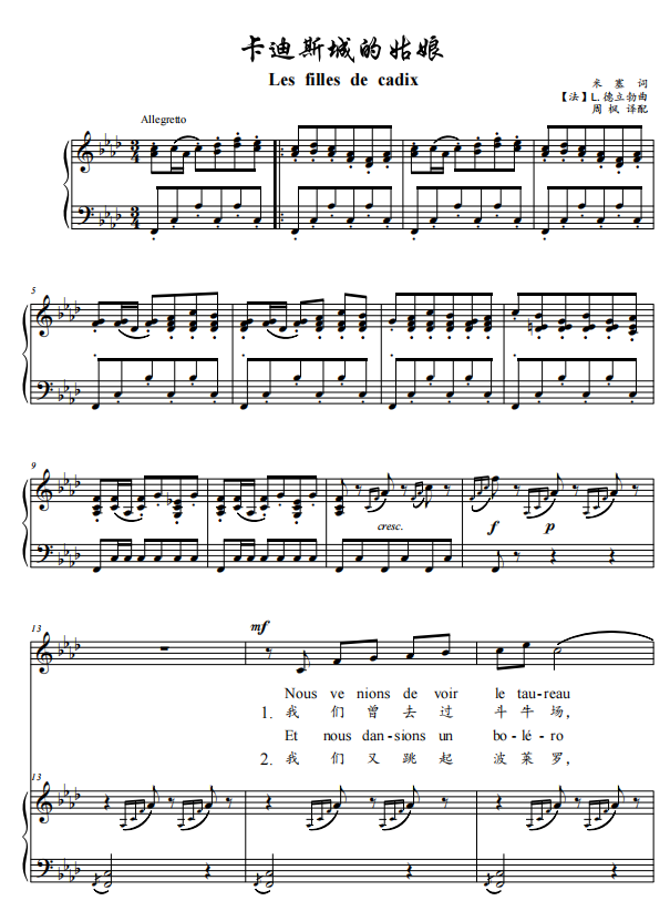 卡迪斯城的姑娘 降A调bA调 声乐谱 钢琴伴奏 五线谱 歌谱