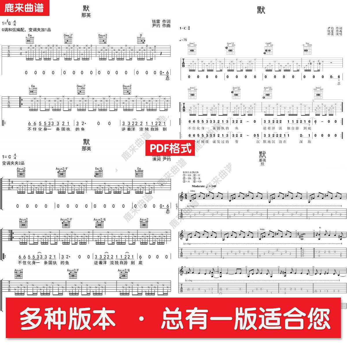 默 那英 共四个版本全发 吉他谱 指弹谱 六线谱 PDF格式