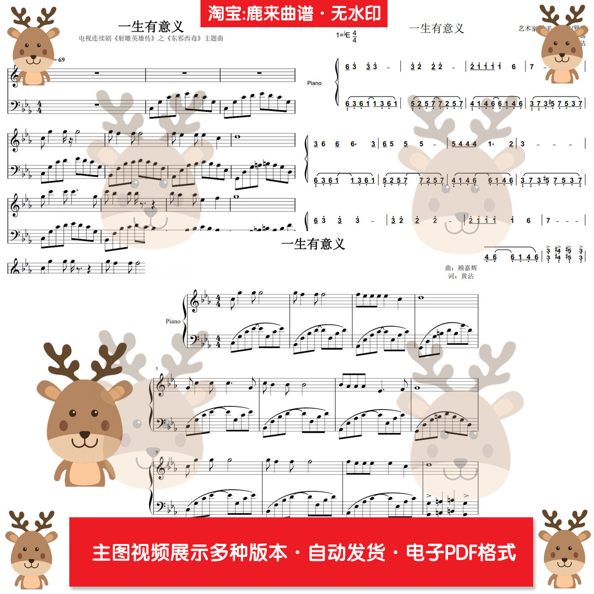 一生有意义 射雕英雄传 共3个版本 钢琴谱 钢琴简谱 PDF电子格式