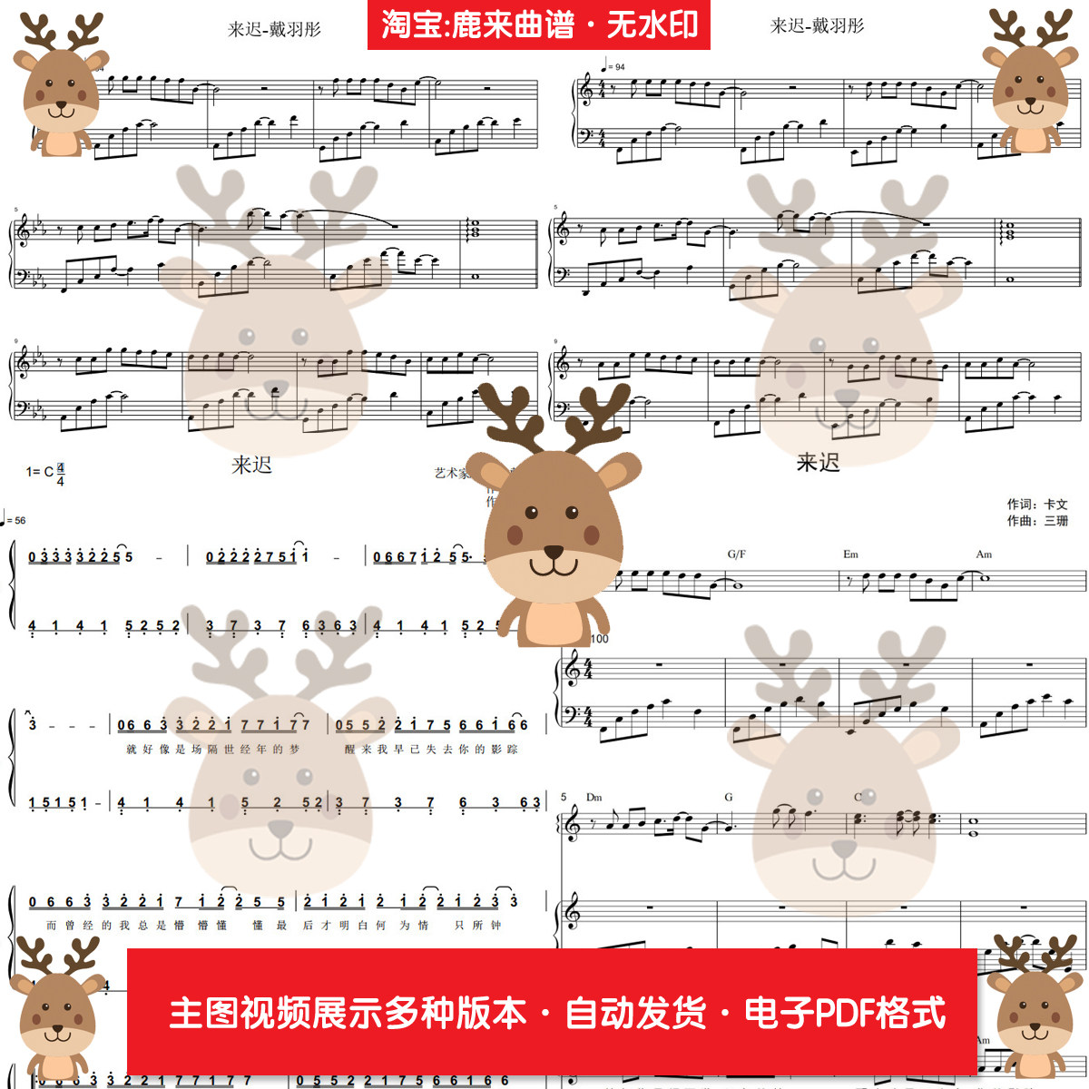 来迟-戴羽彤 共18个版本 钢琴谱 钢琴简谱 弹唱谱 PDF电子格式
