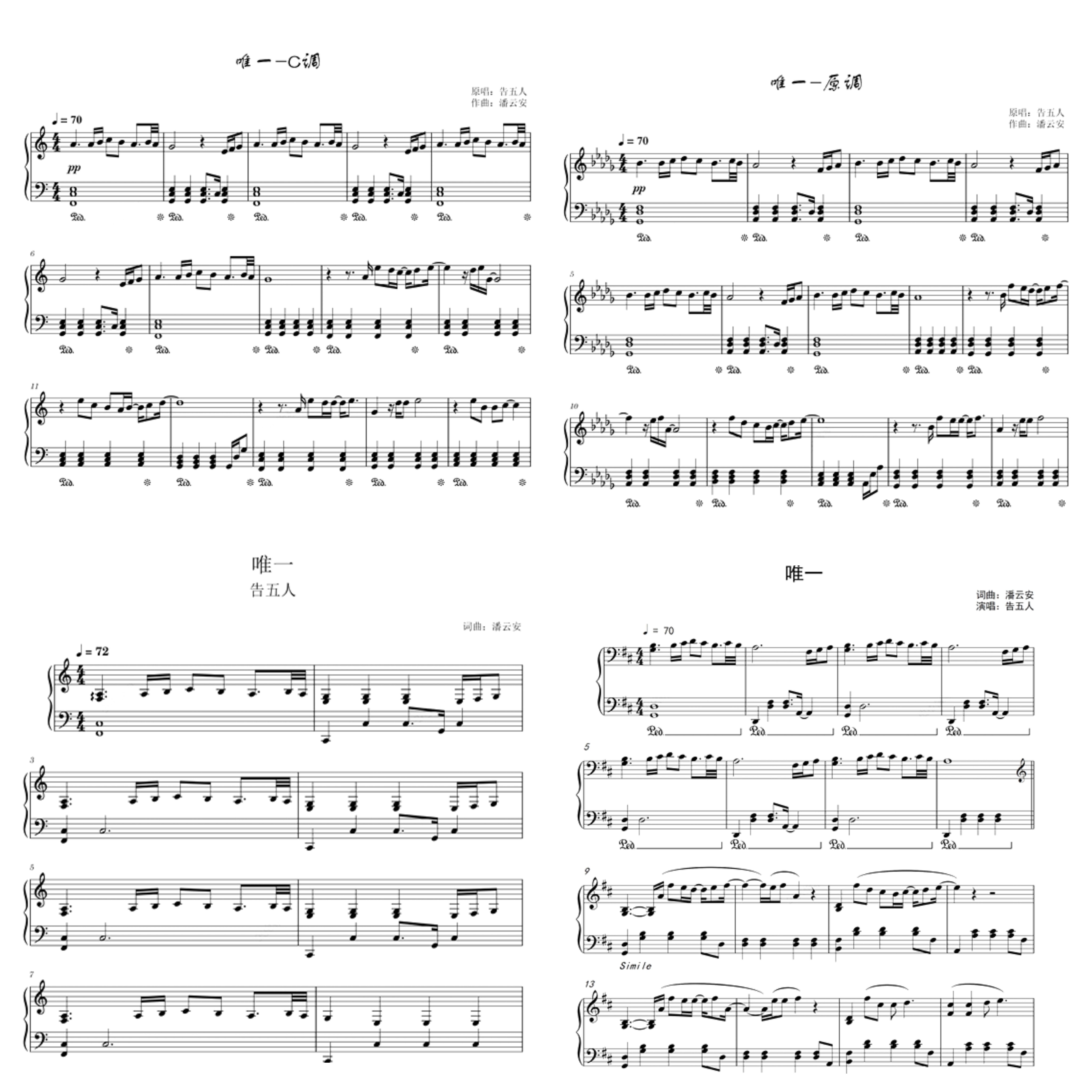 唯一 钢琴谱 五线谱 简谱 弹唱谱 带歌词 75个版本全发