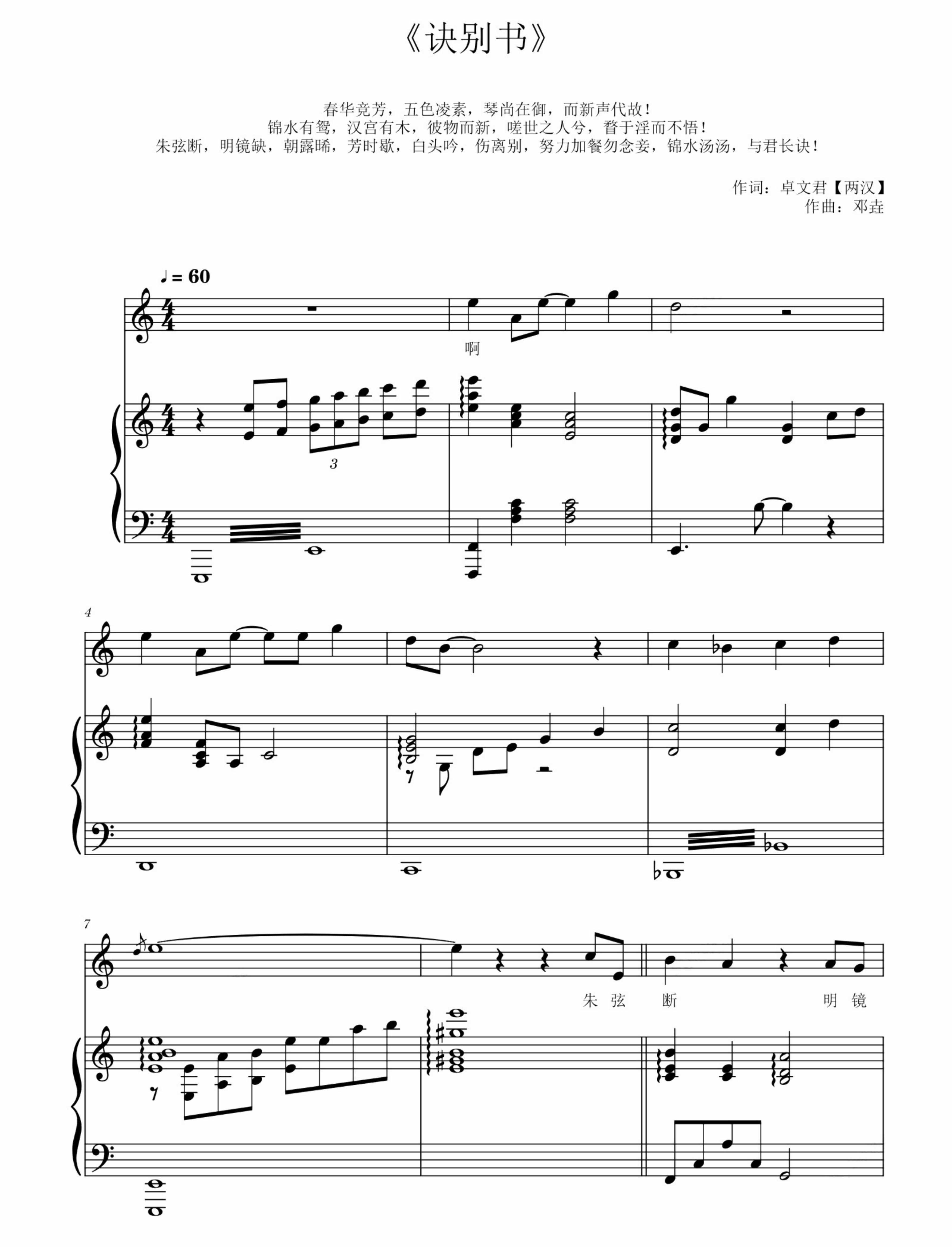 诀别书 邓垚 钢琴谱 正谱 五线谱 弹唱谱 带歌词 比赛曲目10页