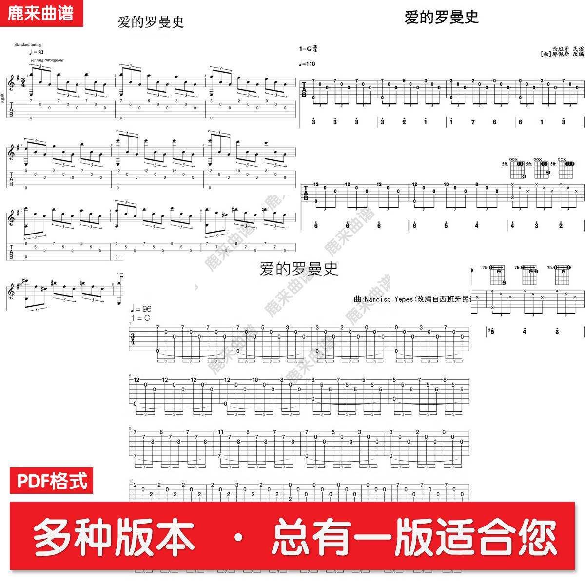 《爱的罗曼史》共三个版本全发 吉他谱 六线谱 电子PDF格式
