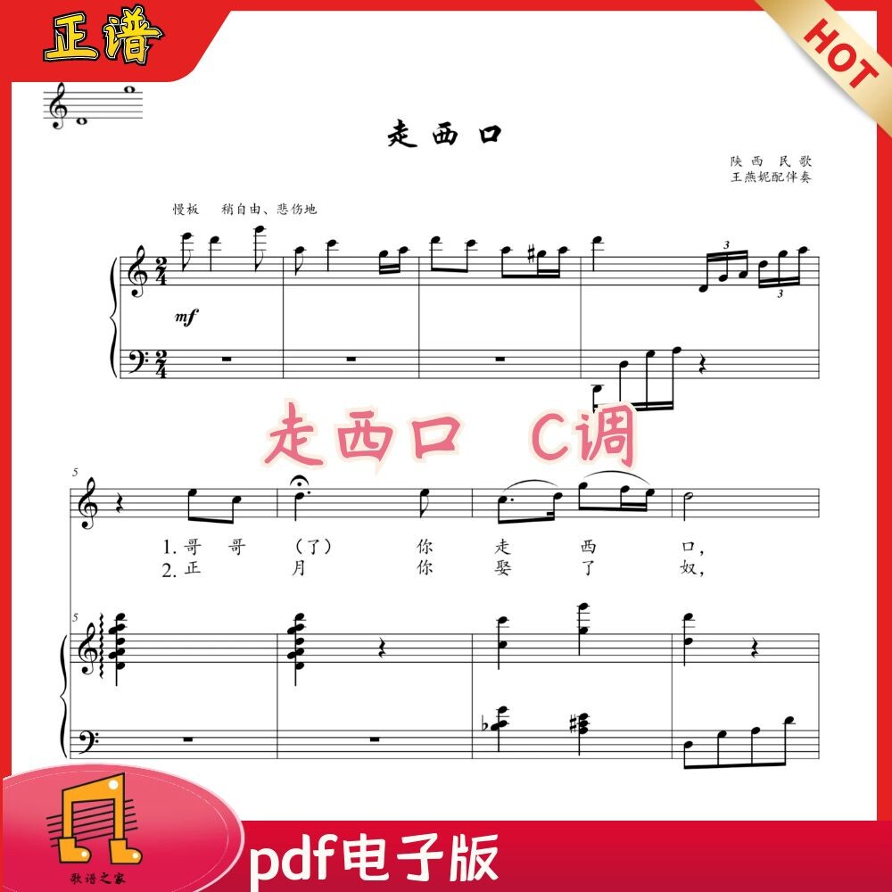 走西口C调正谱 陕西民歌 王燕妮配 声乐谱钢琴伴奏谱五线谱歌谱