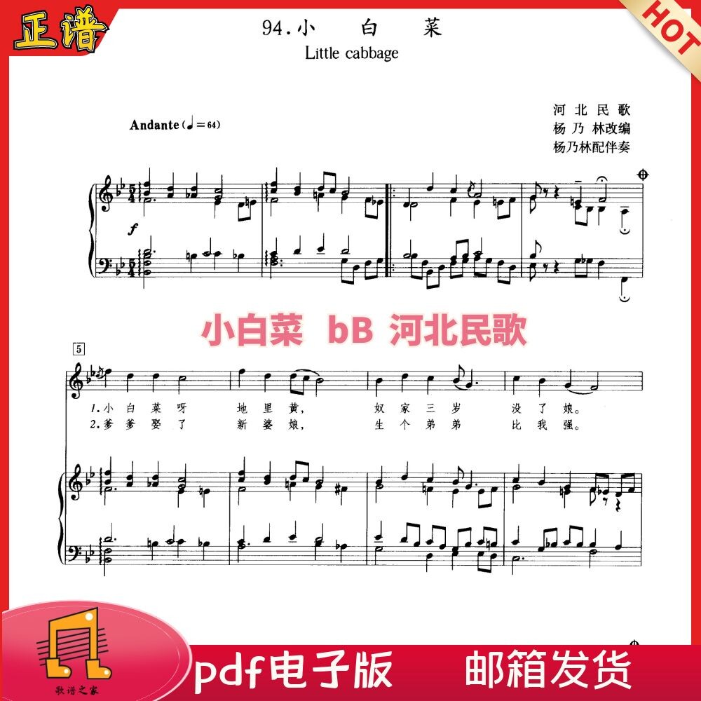 小白菜bB 正谱 河北民歌 声乐钢琴五线谱