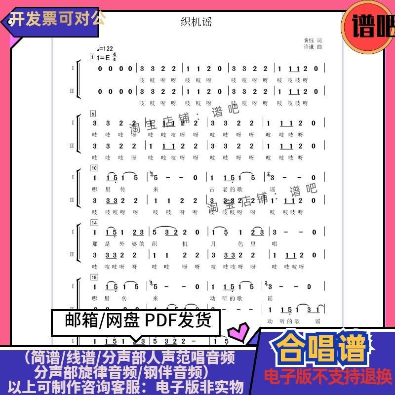 织机谣合唱谱童声女声 二声部简谱/五线谱伴奏谱/音频伴奏/分声部音频范唱