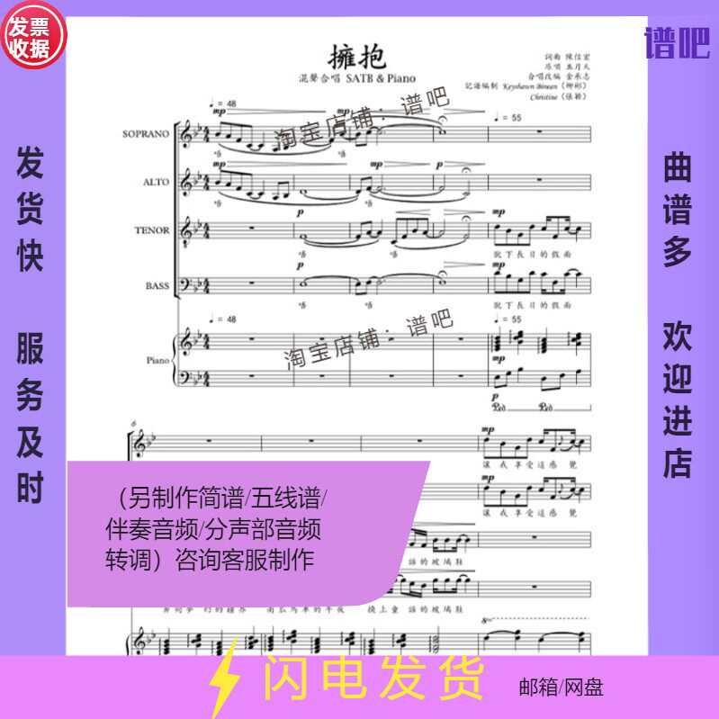 拥抱合唱谱 五线谱正谱 混声合唱 SATB带钢伴 高清