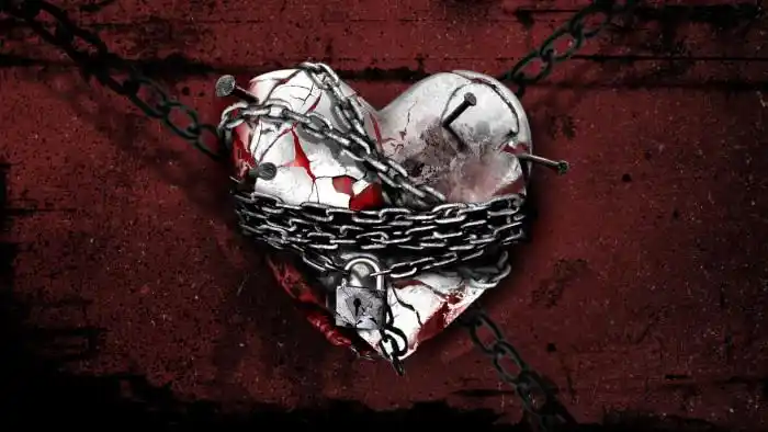 封锁链条爱的锁闭心脏形状与铁链在木背景上安全浪漫设计图片