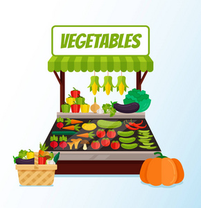 新鲜蔬菜街商店市场充满新鲜蔬菜. 矢量平面卡通平面图形设计照片
