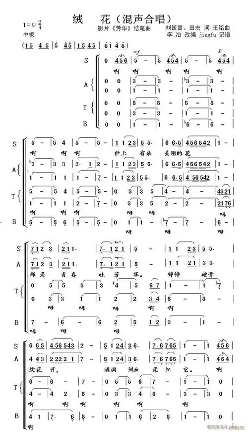 赵胤先声乐曲谱《绒花》(合唱谱"为声乐组合,中小型合唱团 速编")
