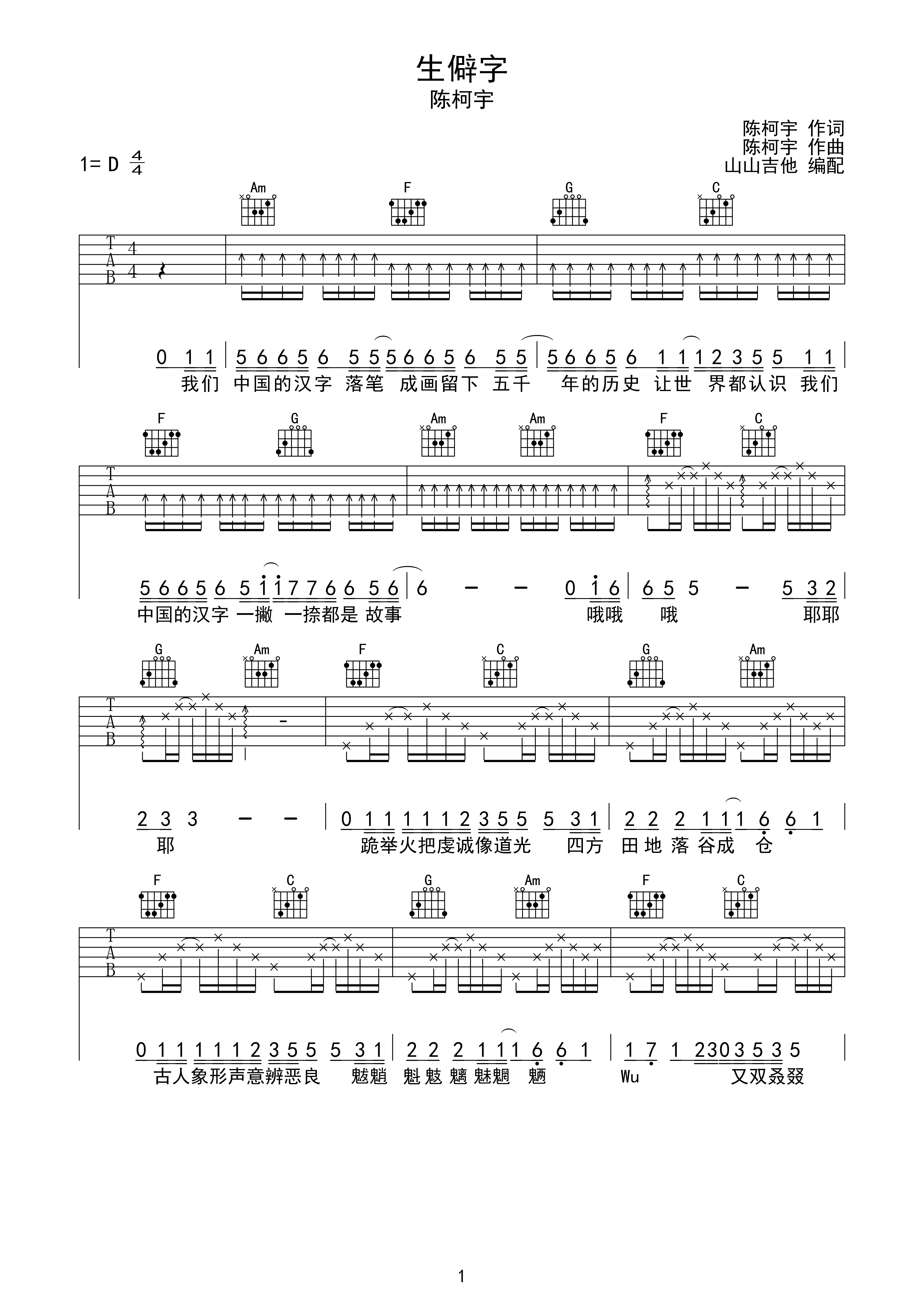 《生僻字》吉他谱c调入门版 陈科宇 高音教编配