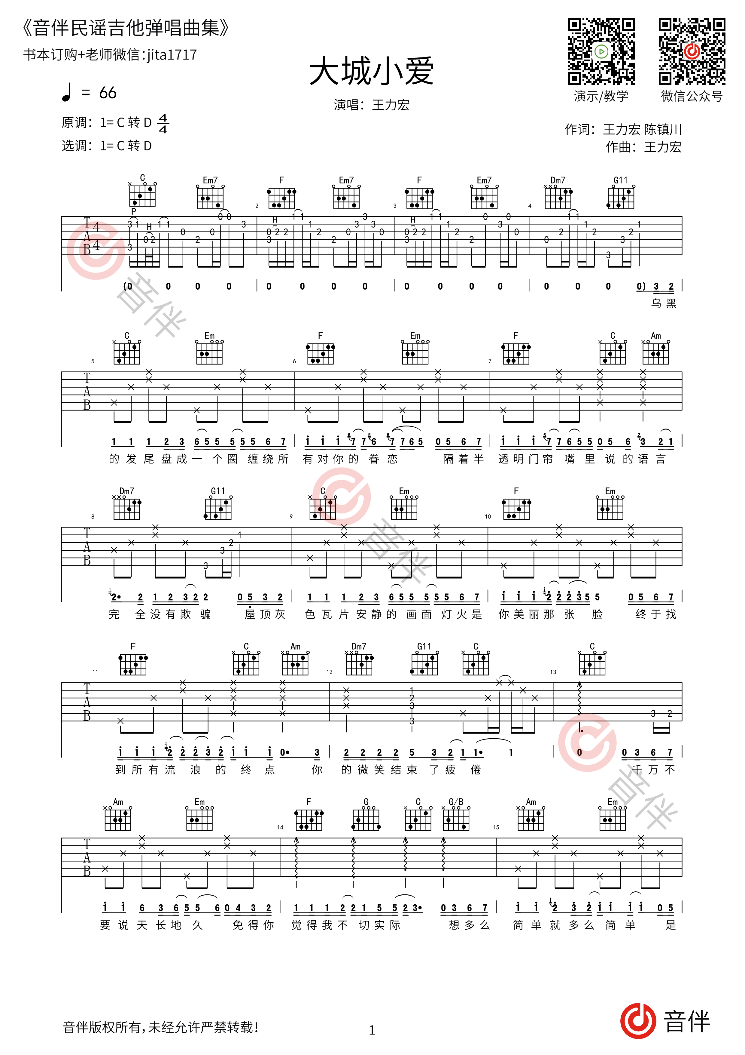 大城小爱吉他谱 王力宏 c调超原版编配