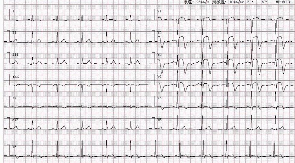 心电图示:窦性心律,急性前间壁高侧壁心肌梗死.