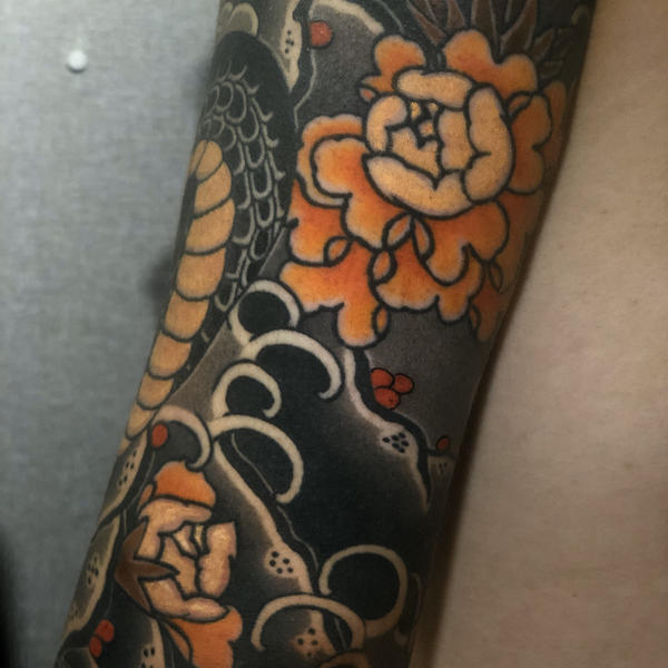 七分袖半甲:牡丹蛇雾面全程圆_纹身吧社区 - 纹身大咖