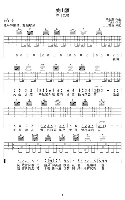 关山酒吉他谱_等什么君_c调指法_高清弹唱图片谱