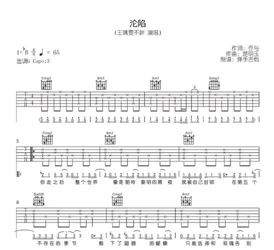 沦陷吉他谱王靖雯不胖g调原版弹唱六线谱