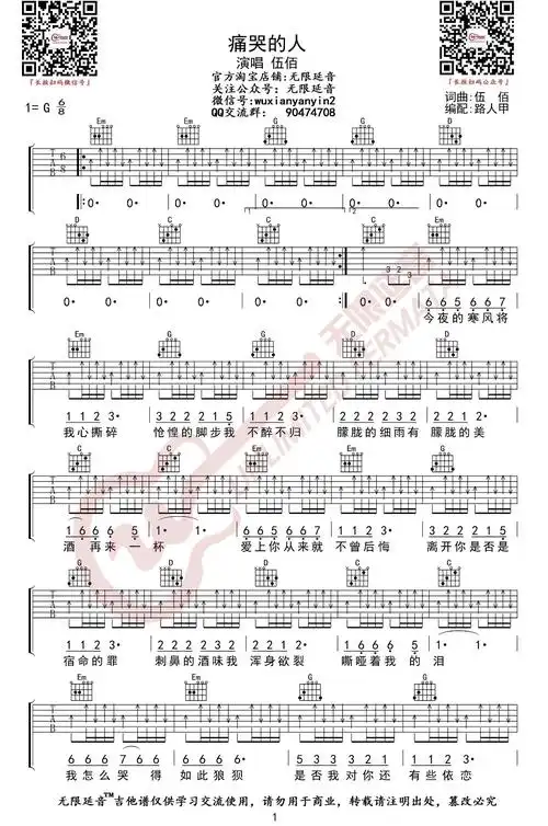 吉他源-伍佰《痛哭的人》吉他谱-吉他弹唱伴奏六线谱-g调指法-无限