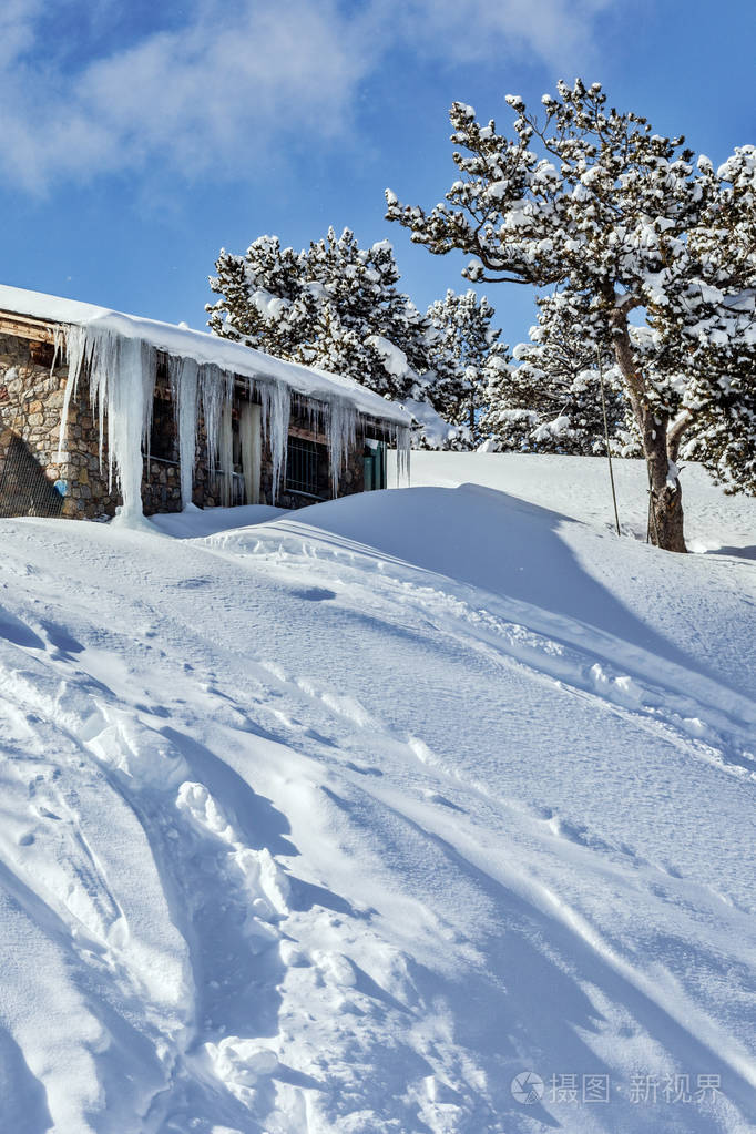 冬天结束时寒冷的一天屋顶上的冰柱比利牛斯山和罗拉是一座民族风格的