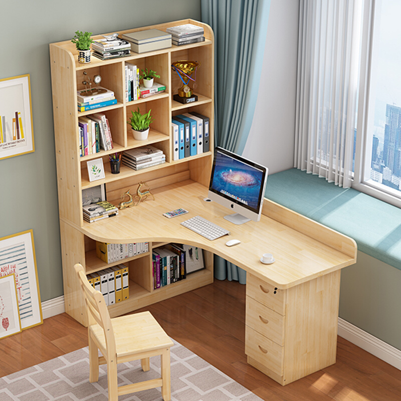 实木电脑桌转角书桌书架组合简约家用儿童学习写字桌卧室一体书柜