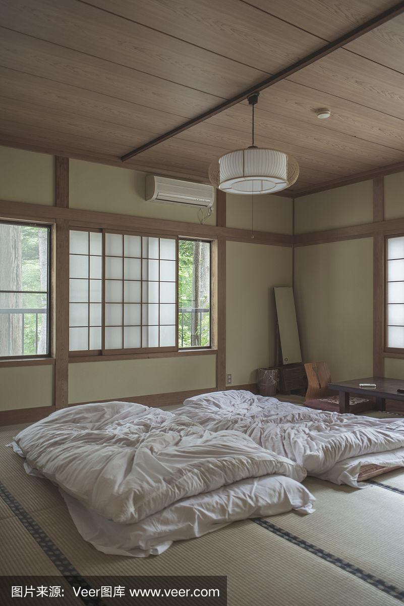 卧室内部是老式日本日式房间,里面有白色的榻榻米床垫.