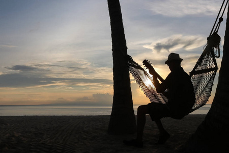 度假时坐在海滩上弹古典吉他的帅哥
