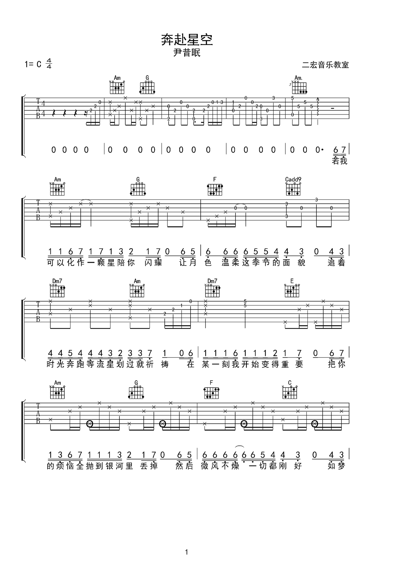 二宏音乐 - 奔赴星空 原版吉他谱(c调指法)