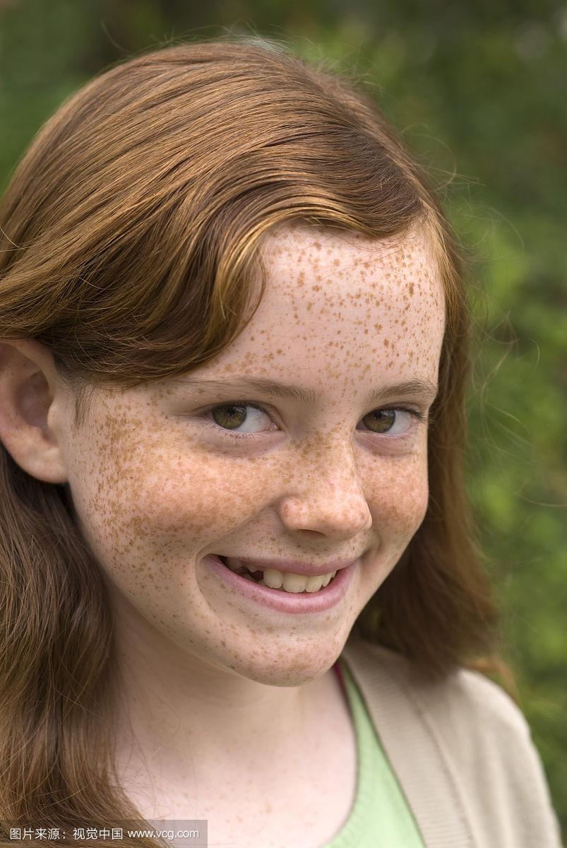 红发雀斑脸女孩,微笑和快乐的青春期前儿童户外