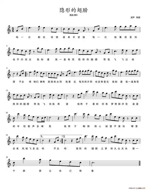 隐形的翅膀五线谱