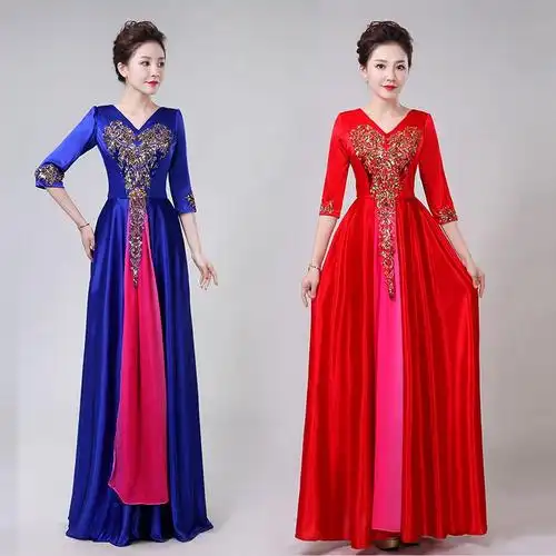 新款合唱服女长裙中老年大合唱演出服成人红歌团体民族服装
