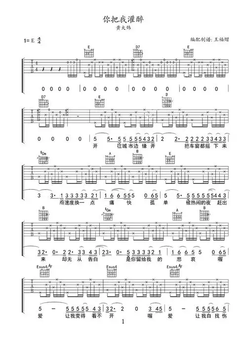 你把我灌醉吉他谱 黄大炜 e调完美版 高清六线谱