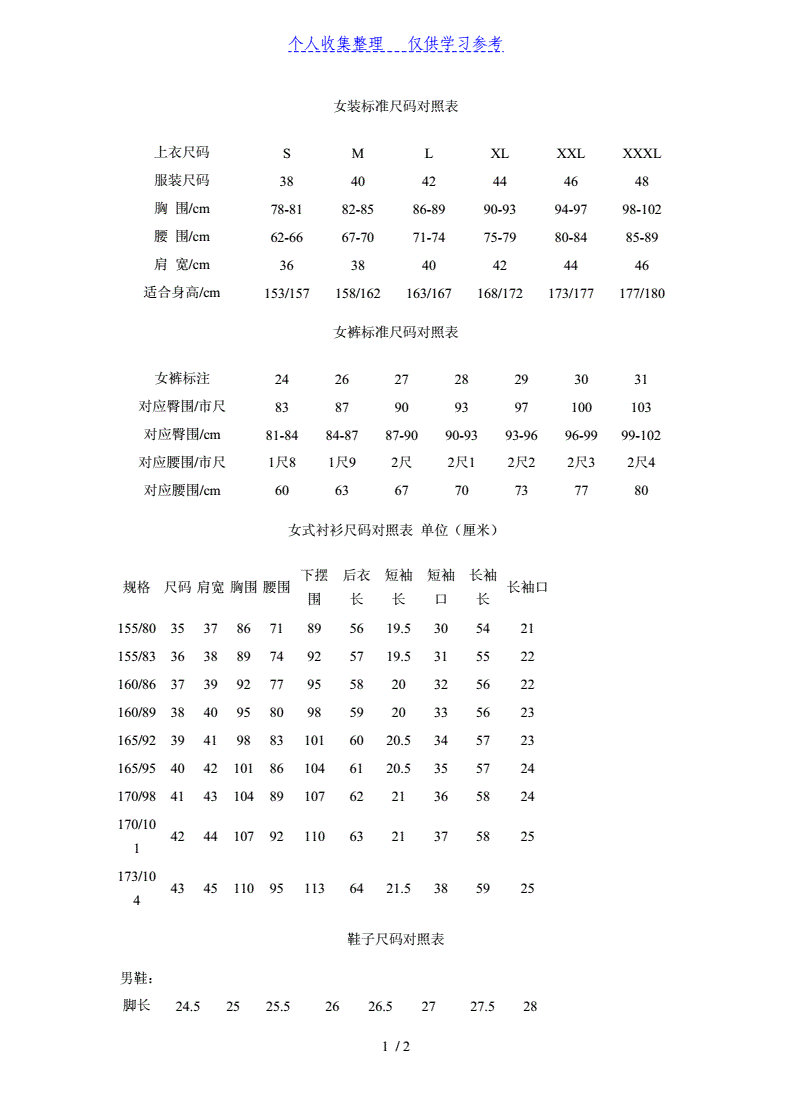 衣服尺码对照表(完美版)