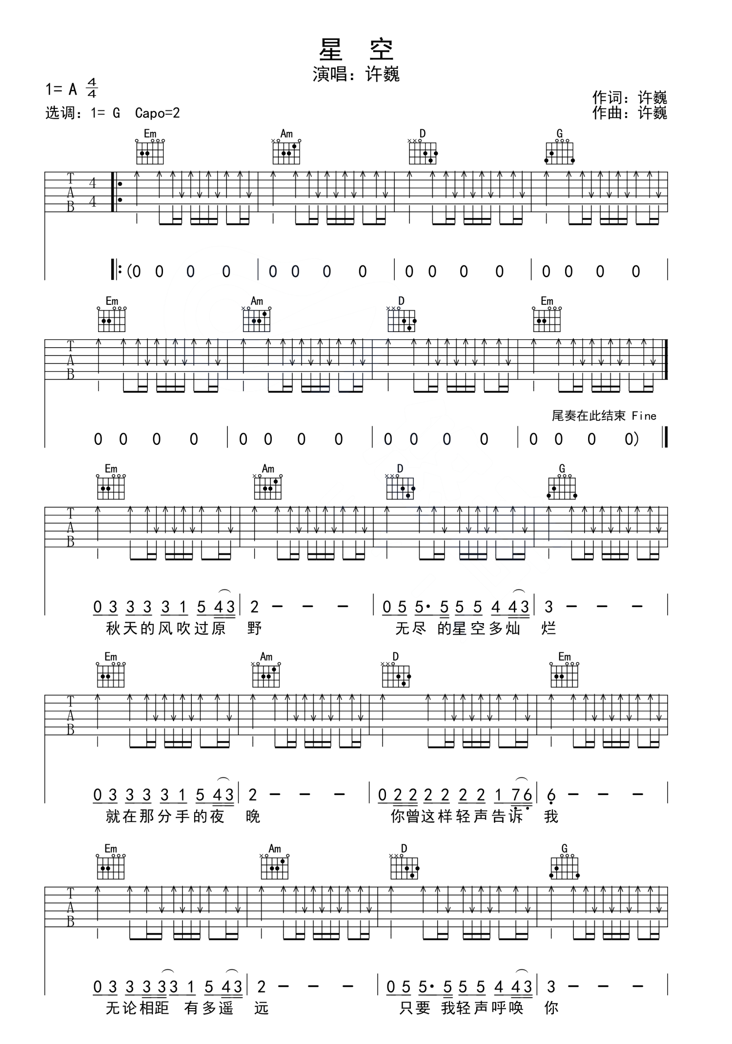 星空吉他谱图1-许巍-g调指法