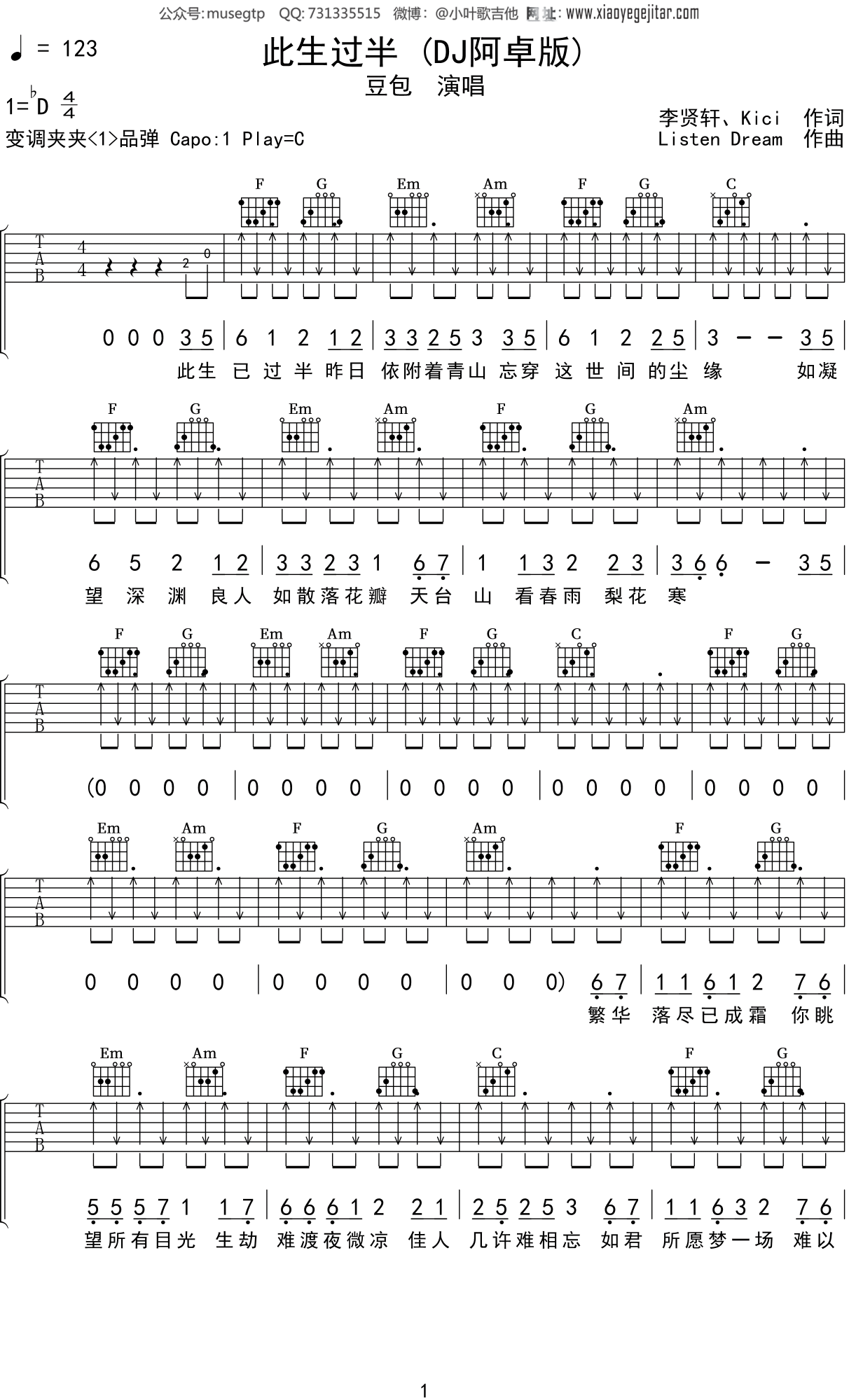 dj阿卓版《此生过半》吉他谱c调吉他弹唱谱