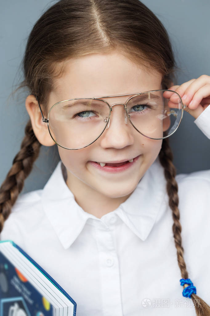 戴眼镜的小快乐女孩.教育, 学校, 学龄前儿童.聪明的孩子与书