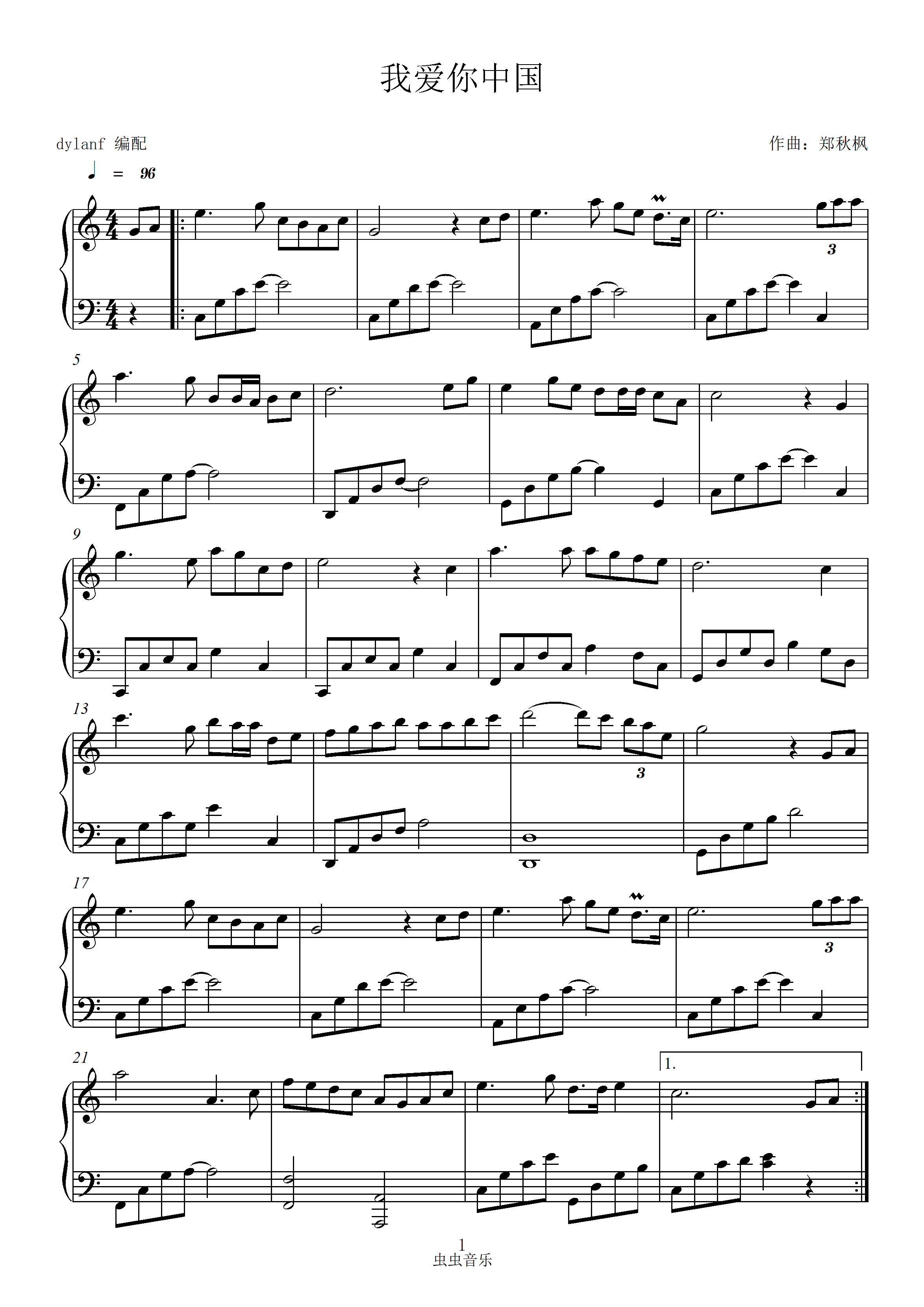 我爱你中国 好听易弹钢琴谱-c调-虫虫钢琴