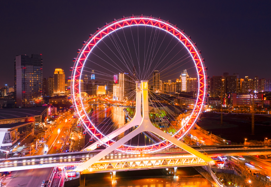 建在河边的城市与巨大的摩天轮天津旅游