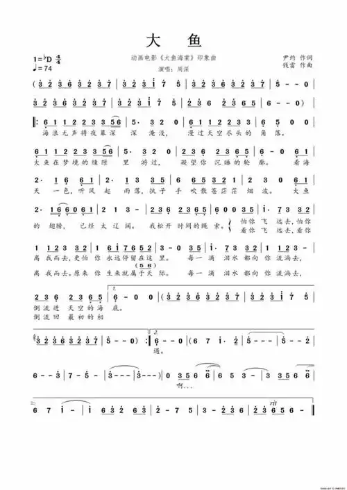 大鱼简谱(歌词)_周深演唱_天之韵记谱