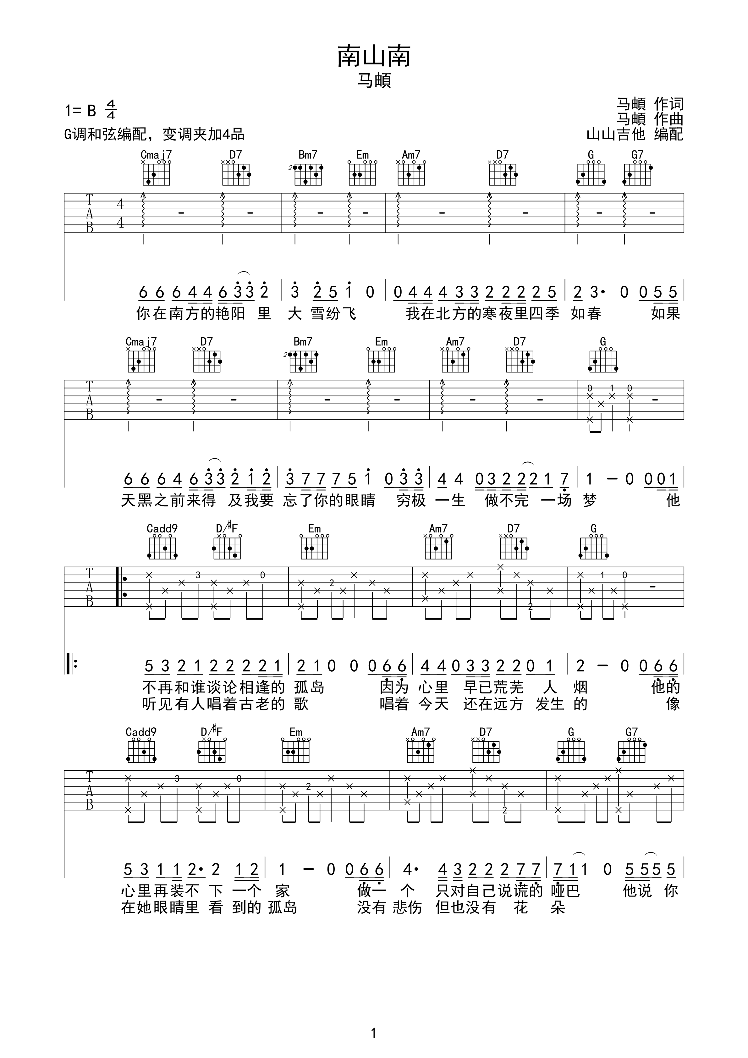 马頔南山南吉他谱g调弹唱谱高清图片谱