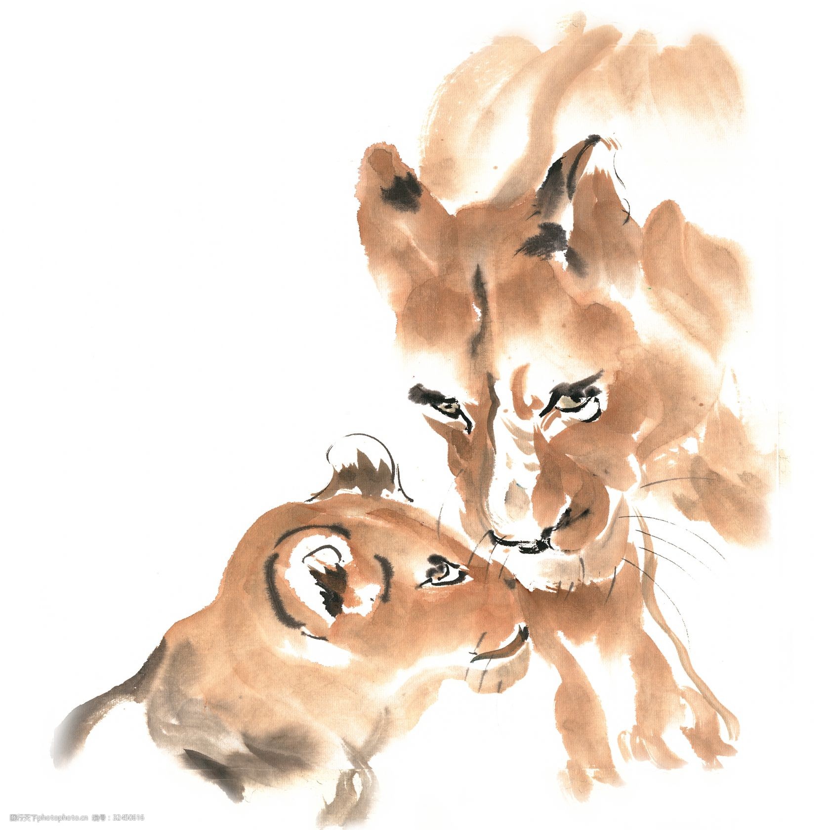 舔犊情深的狮子水墨画png免抠素材