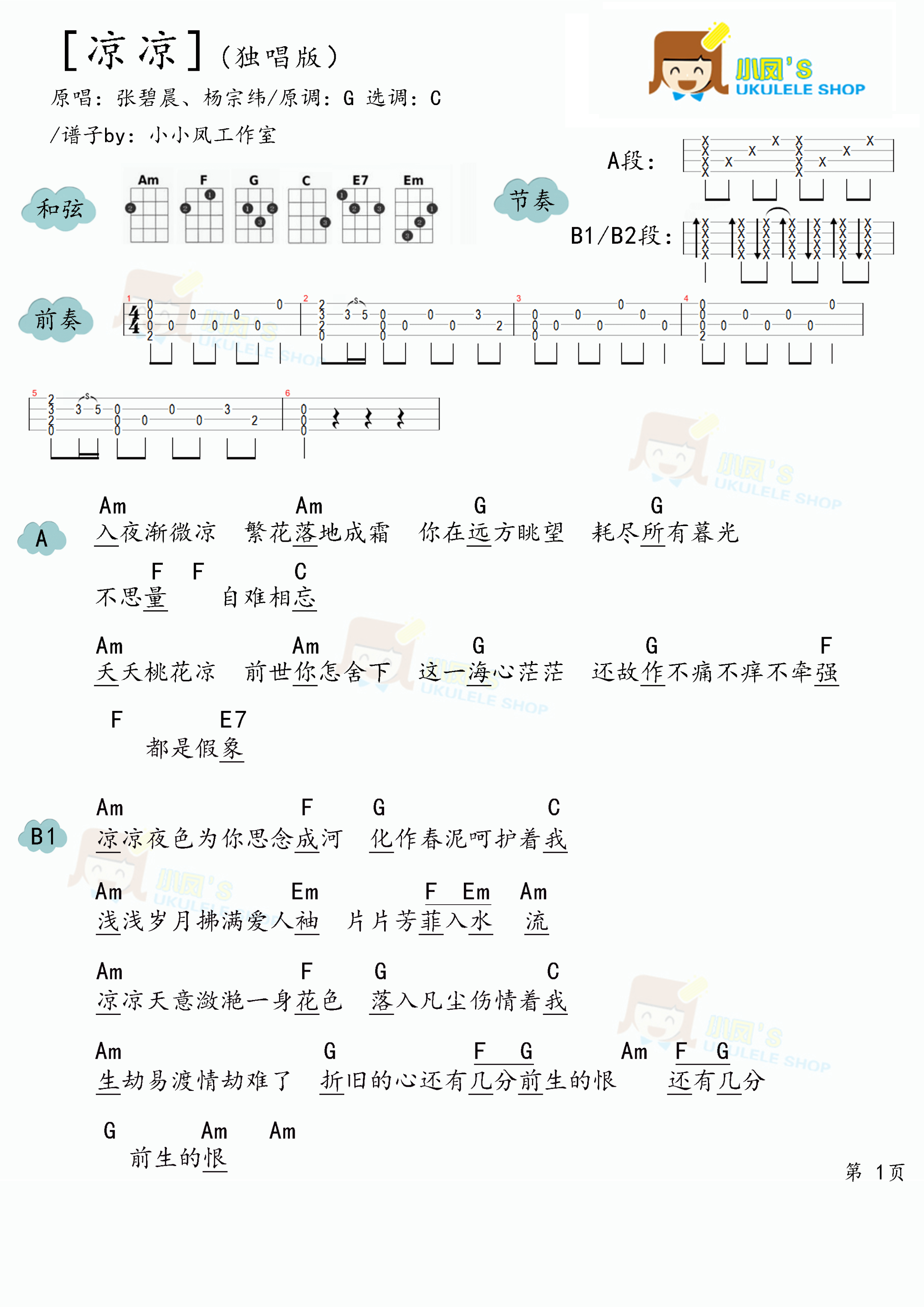 《凉凉》尤克里里谱/弹唱视频教学_多版本谱(小凤)