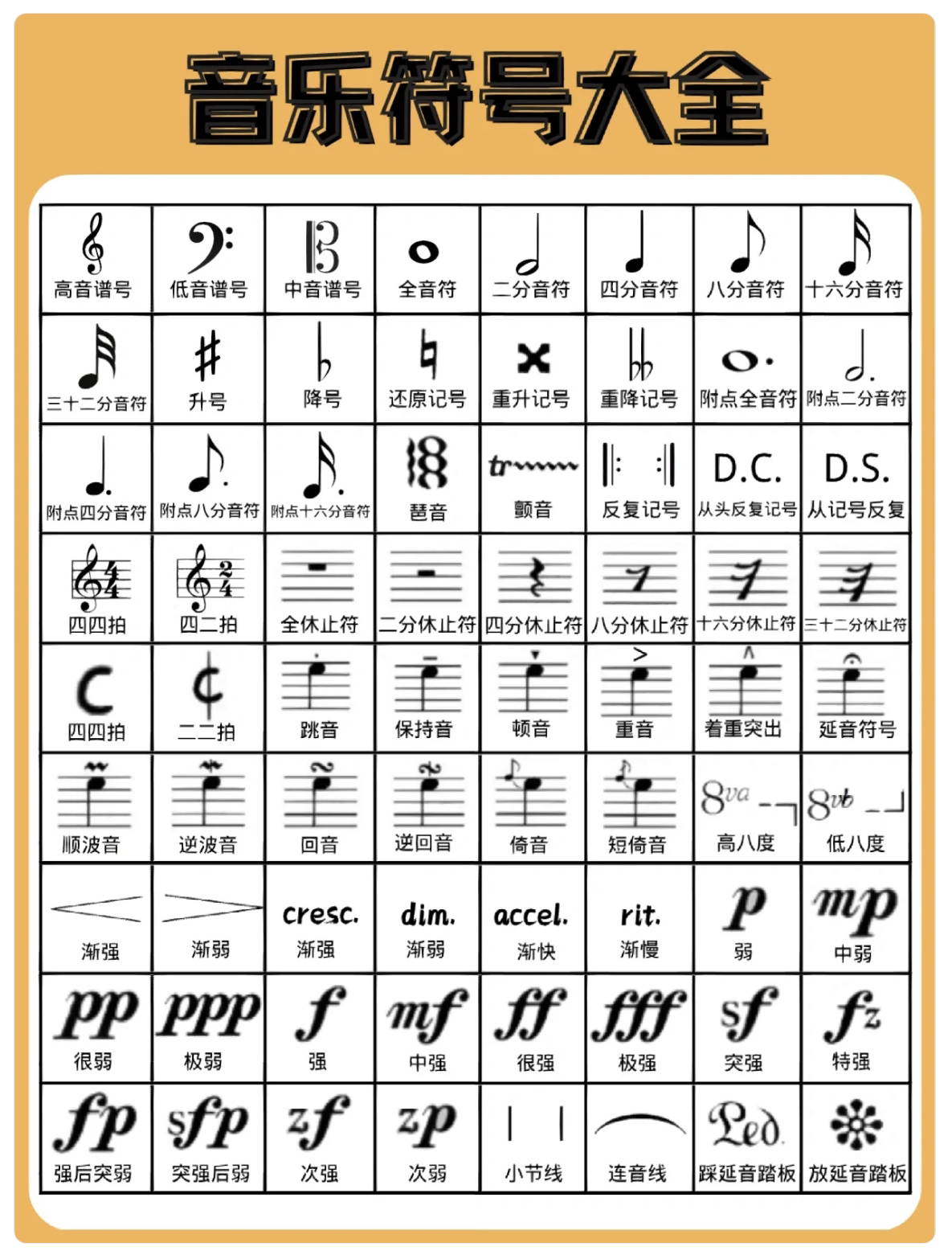 音乐标记符号大全 音乐符号是乐谱里常用的符号,用以表达声音的不同