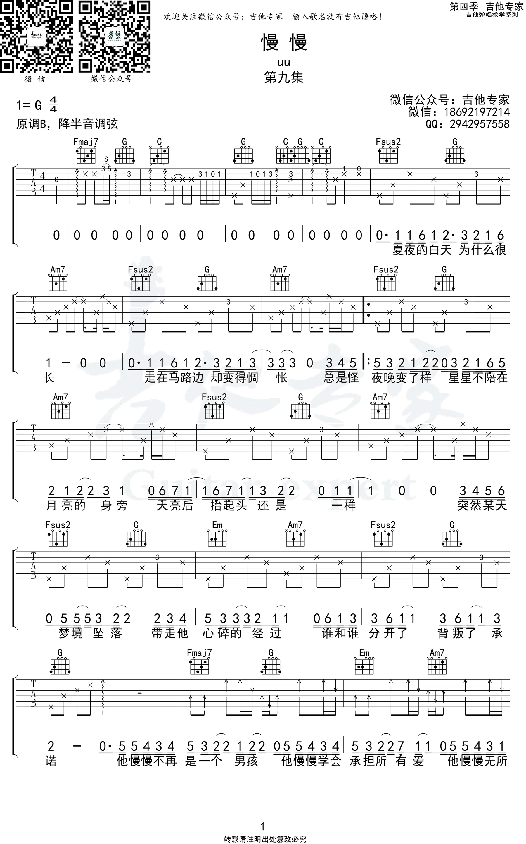 《慢慢》吉他弹唱谱子流行简单零基础教学 他慢慢不再是一个男孩