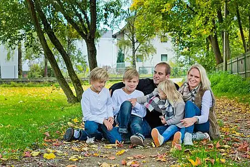 家庭,三个孩子,坐,草地,秋叶