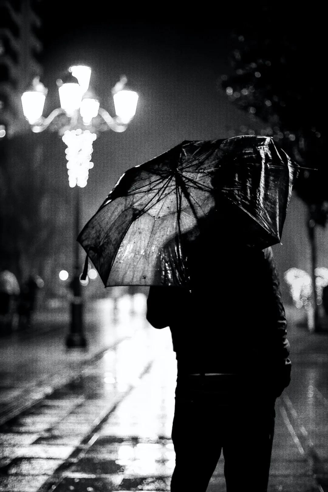 雨中漫步,路灯下撑伞的人.
