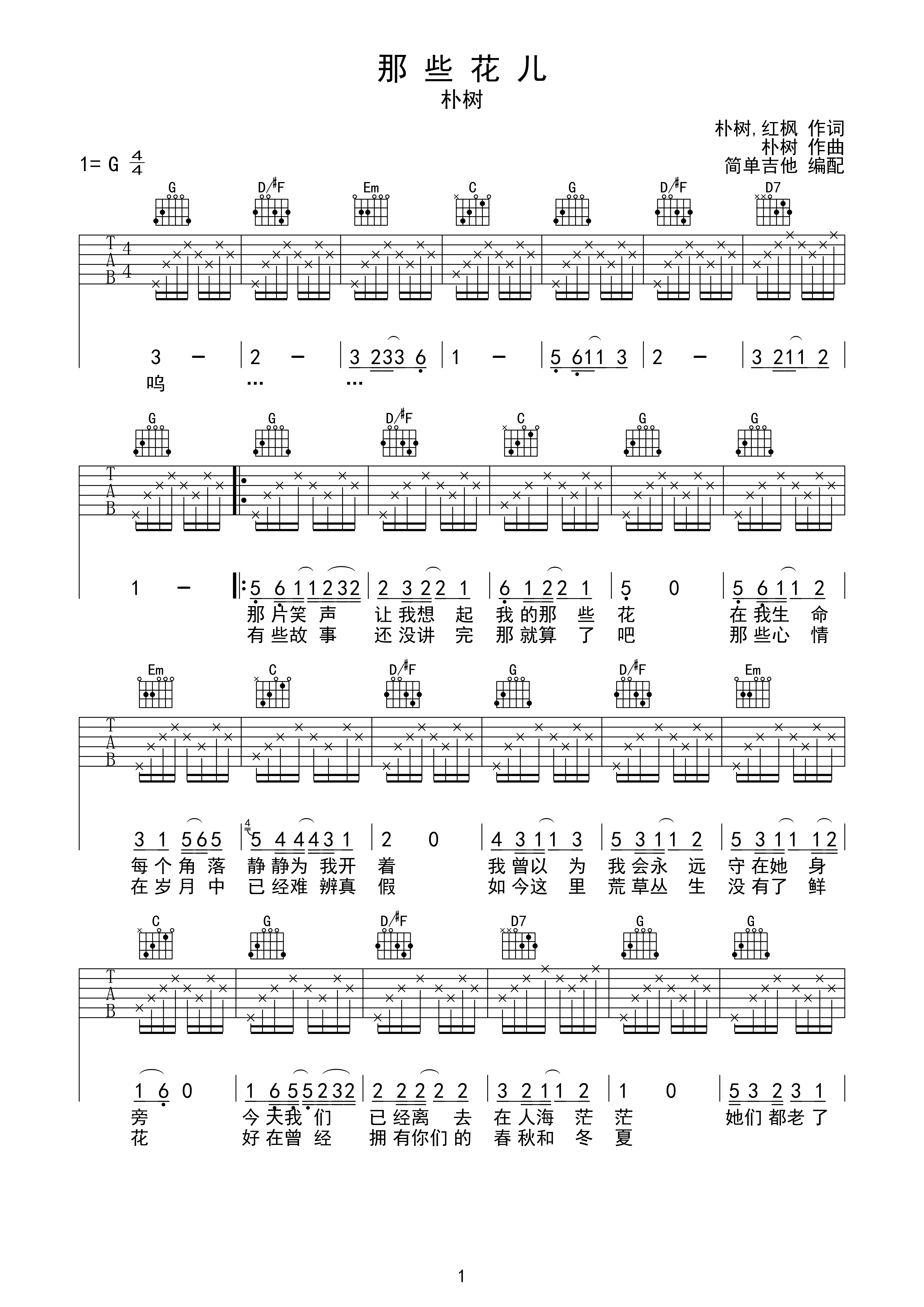 朴树那些花儿吉他谱g调高清版