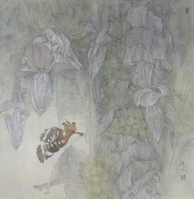 芭蕉层层翠绿展,鸟儿翩翩醉花间. 一幅明媚的工笔画作品完成. - 抖音