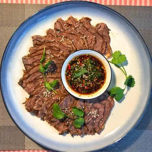 11.牛肉切片摆盘,和蘸料汁一同上桌.ps:1.不用高压锅,用砂锅味道更好.