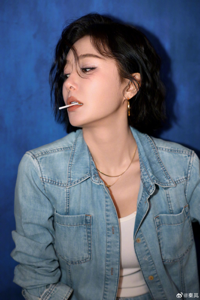 秦岚短发,黑色吊带牛仔,精致迷人
