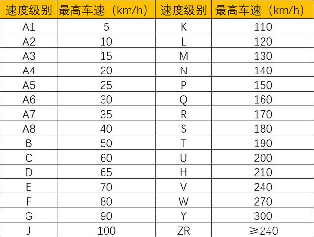 v:速度级别,下图是速度级别与轮胎可承受最高车速对照表,车速超过轮胎